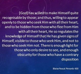 [God] has willed to make Himself quite recognisable by those; and thus, willing to appear openly to those who seek Him with all their heart, and to be hidden from those who flee from Him with all their heart, He so regulates the knowledge of Himself that He has given signs of Himself, visible to those who seek Him, and not to those who seek Him not. There is enough light for those who only desire to see, and enough obscurity for those who have a contrary disposition (Penseés, 430).